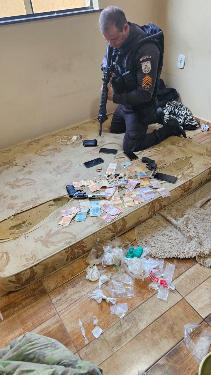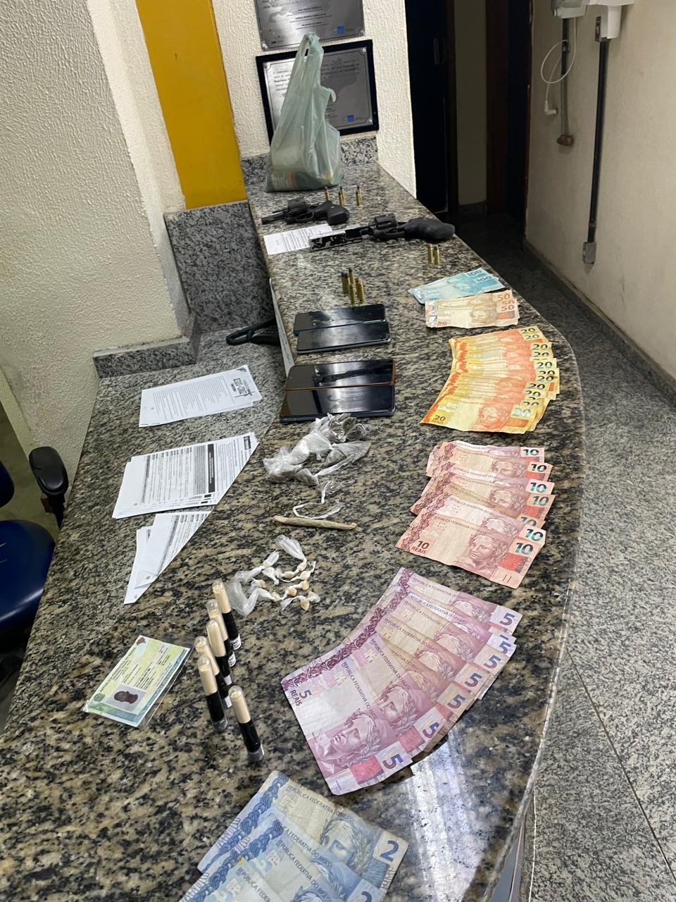Após um dos jovens admitir que havia armas de fogo na casa, os oficiais revistaram o local e encontraram dois revólveres calibre 38; 14 munições; 6g de cocaína; 11g de crack; 12g de maconha; 4 celulares; e R$778,00 reais.